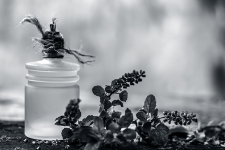 Ocimum tenuiflorum,Holy Basil leafs on rusted wooden surface with extracted oil of holy basil.