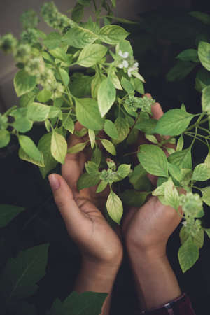 Basil plant with flowers holding by hand in organic vegetable garden