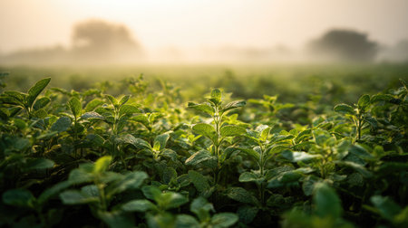A panoramic wide view of Ajwain field growing closely together at dawn gentle morning light illuminating fresh leaves ultra realistic photography cinematic wide composition lifelike natural scene
