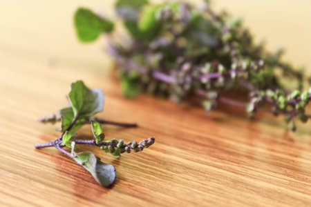 holy basil herbs on wood chopping block