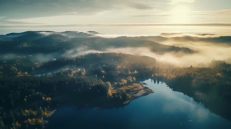 Aerial view of beautiful autumn landscape with forest and lake in sunrise