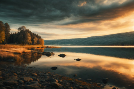 Autumn sunset at Lake Syvajarvi, in Hyrynsalmi, Finland. Reflection of red-orange petals on the lake surface. Storm clouds at sunset. Autumn vibes.
