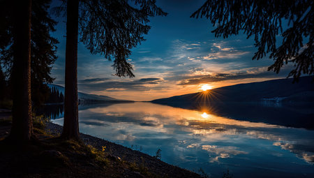 Scenic landscape of a lake and mountains at sunset