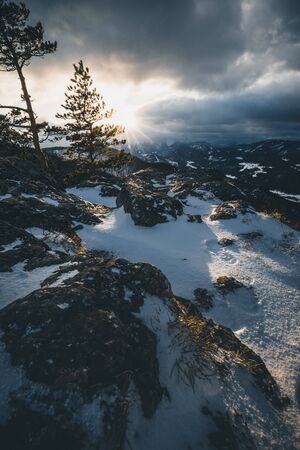 Sunrise, sunset picture in winter, in Scandinavia. Snowie mountains and trees. Travel photography, copy space.