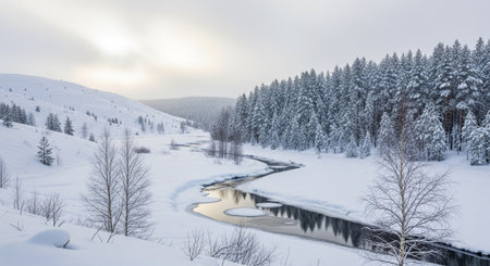 Serene winter scene of snowy river flowing through forest