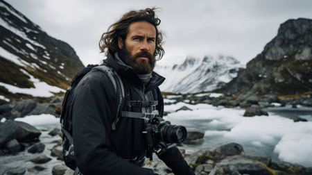 travel photographer taking photo of snowy landscape in Norway in spring, person near beautiful frozen lake in mountains