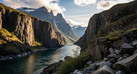 Breathtaking views of Norwegian national park, river and fjords at bright day.
