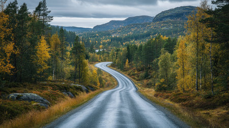 Scenic view of a winding road leading through a vibrant autumn forest in the Norwegian wilderness