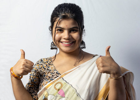 Isolated on white background an Indian female shows double thumbs up with smiling face on white background