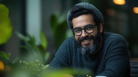 Man with a beard happily engages in conversation while surrounded by greenery and soft lighting.