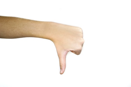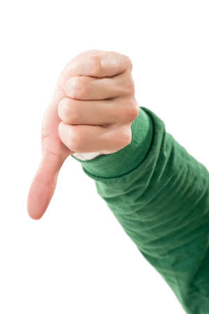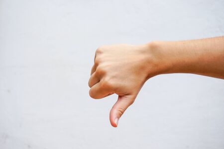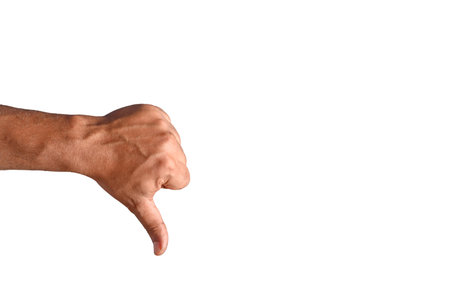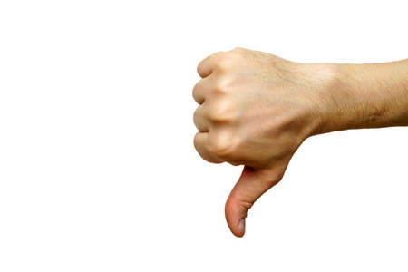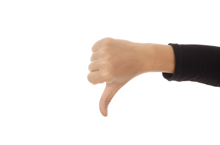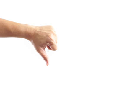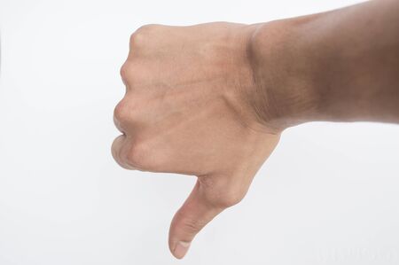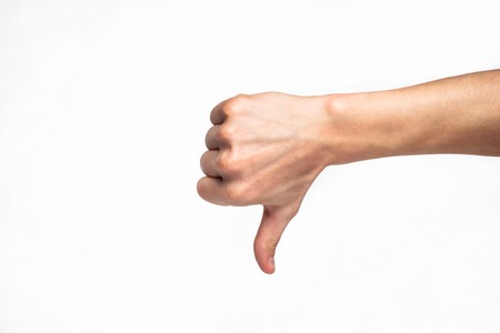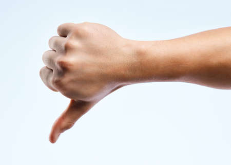 Thumb down gesture on white background.
