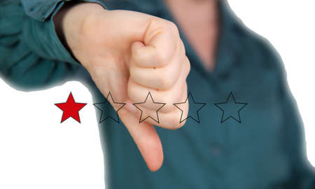 Bad review, Thumb down with red stars for bad service dislike bad quality, Customer experience, rating, social media concept background