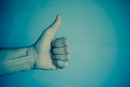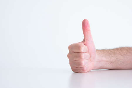Male hand showing thumb up sign on white background. Close up.
