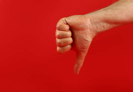 Man hand shows thumb down on red background.
