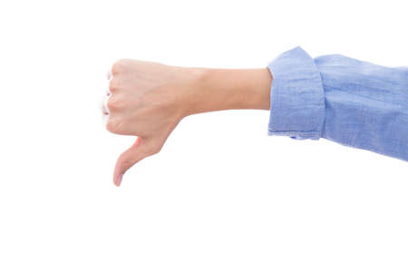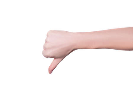 Woman hand showing thumb down isolated on white background