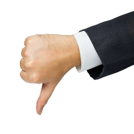 Male hand of businessman in suit showing thumb down on white background