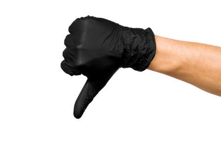 a man's hand in a black rubber glove shows a finger down isolated on a white background