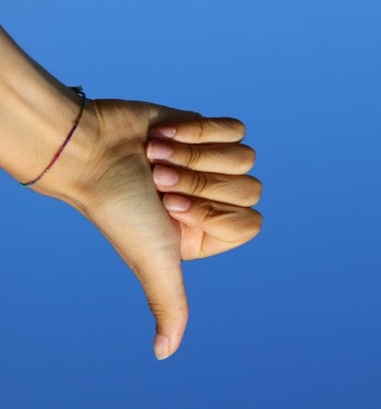 Right hand showing thumb down on blue background