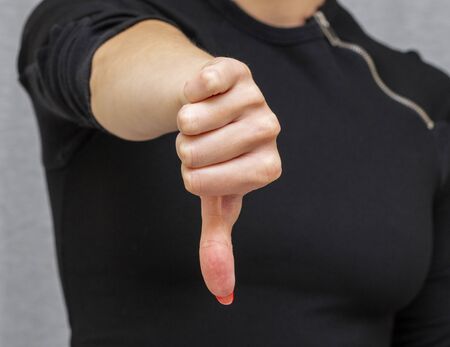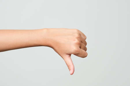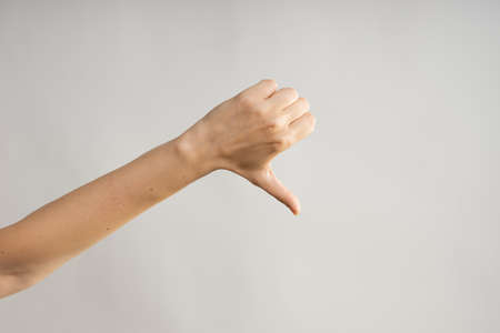 Hand gestures, Thumbs down, dislike disapproval. womens hand. light grey background