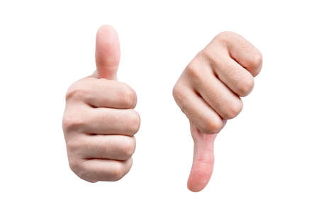 Hands showing thumbs up and showing thumbs down gesture isolated over white background