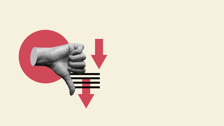 Contemporary art collage showing a hand giving a thumbs down surrounded by red arrows pointing down, concept of negative feedback and bad review