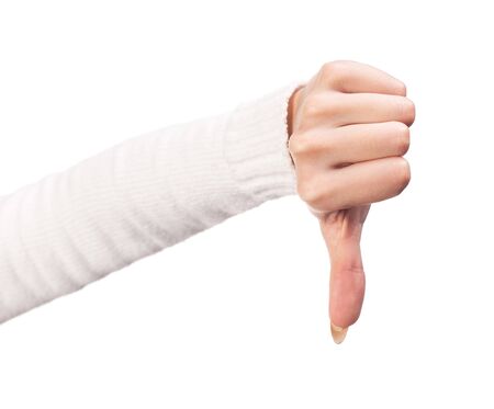 Closeup on woman hand showing thumbs down sign against white background