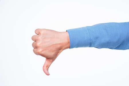 Closeup of male hand showing thumbs down sign against white background