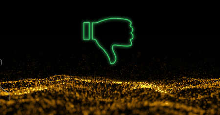 Image of neon hand down over black background with gold glitter. computers, communication and entertainment concept digitally generated image.