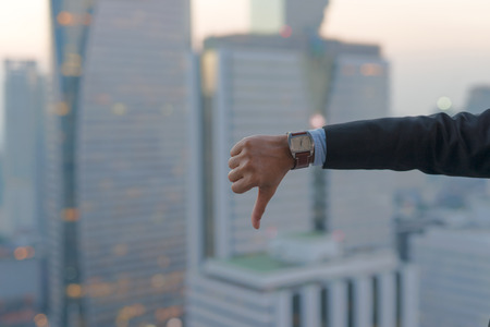 Thumbs down hand sign showing by businessman with cityscape on modern building in Business district at Bangkok city background, Symbols concept