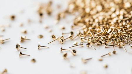 A stunning display of gold push pins emphasizes their shine and design. Perfect for office use, crafting, and creative projects, these versatile fasteners add elegance to any workspace.