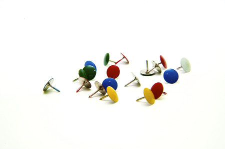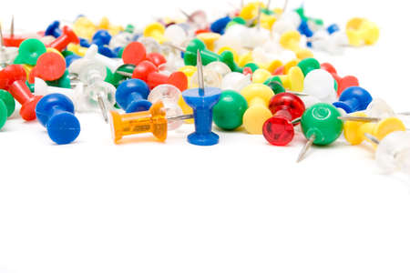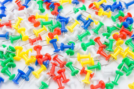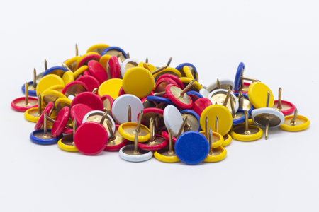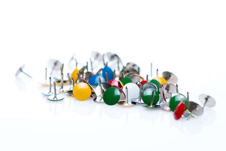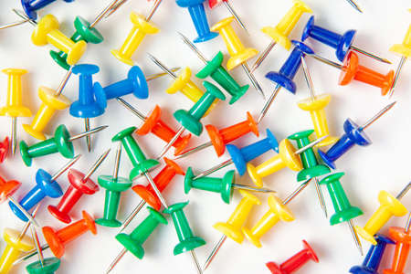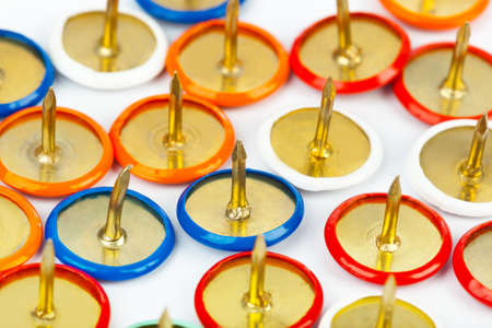 Colorful pushpins on white. Colored pushpins. Office accessories. Office supplies on white.
