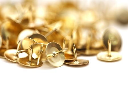 Golden tacks isolated on white.