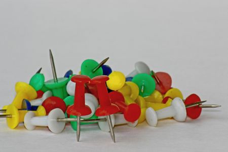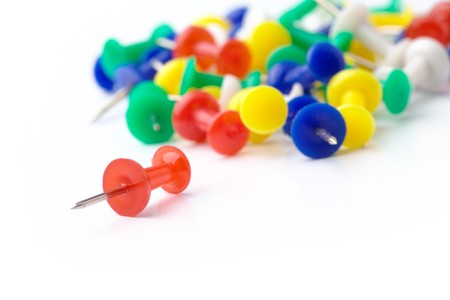 A handful of pushpins in a random position on a white background.