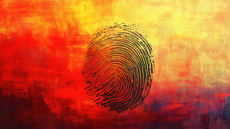 This captivating abstract artwork features a fingerprint emerging against a vibrant backdrop of red and yellow hues, symbolizing identity and uniqueness.