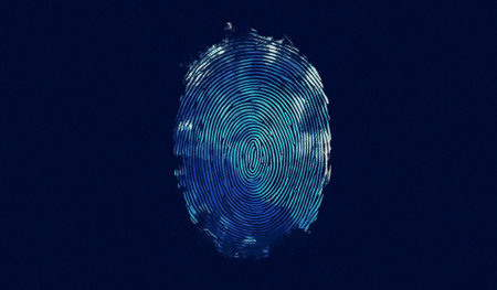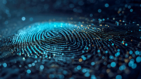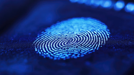 A close-up view of a digital fingerprint, highlighted by a blue glow, showcases intricate patterns while the background remains dark and subtle.