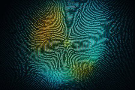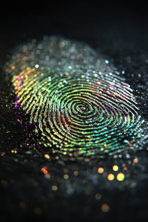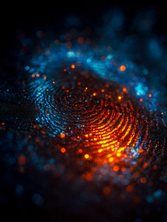 This abstract image showcases a vibrant fingerprint pattern enhanced by bokeh lights, creating a captivating visual experience of identity and technology.