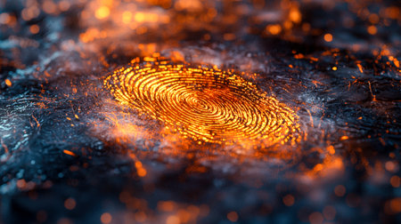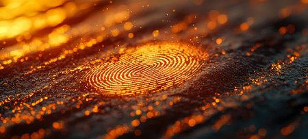 A glowing fingerprint is displayed on a dark and textured surface. The golden lines create a striking contrast against the background, inviting thoughts about identity and individuality.