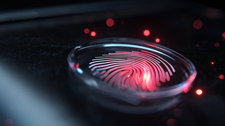 Fingerprint sensor scanner in golden hour light. Extreme macro of glass ridges texture and biometric security.