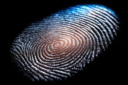 A close view of a fingerprint reveals unique ridges and patterns illuminated by artificial lighting.