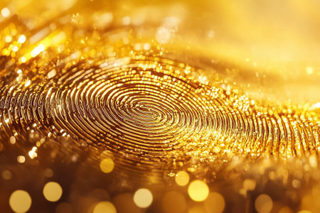A mesmerizing close-up showcases a golden fingerprint, highlighting its captivating swirls and sparkling details.