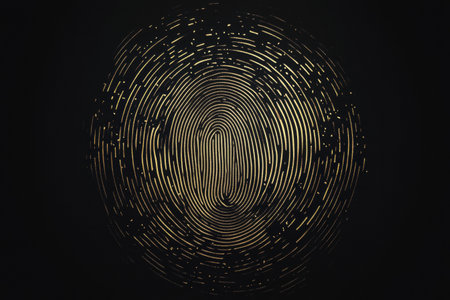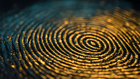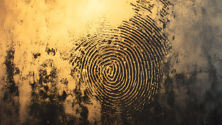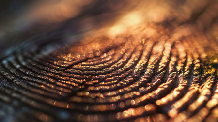 A glowing fingerprint is displayed on a dark and textured surface. The golden lines create a striking contrast against the background, inviting thoughts about identity and individuality.