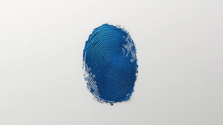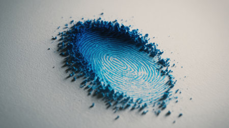 Artistic representation of a blue fingerprint with textured granules, emphasizing the unique swirls and lines on a minimalistic light surface.