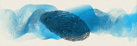 This creative artwork features an intricate fingerprint layered with dynamic blue waves, set against a soft light background, showing unique patterns.