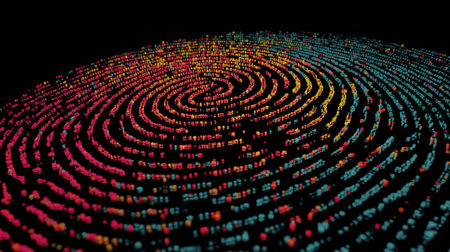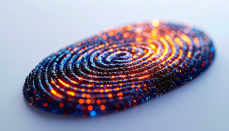This abstract image showcases a vibrant fingerprint pattern enhanced by bokeh lights, creating a captivating visual experience of identity and technology.