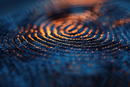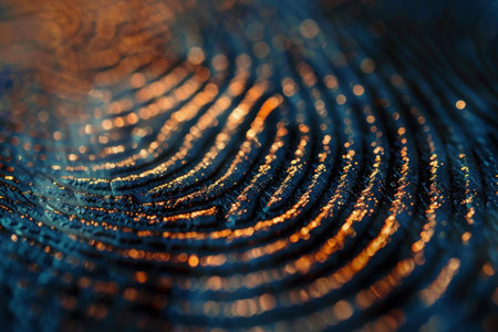Fingerprint sensor scanner in golden hour light. Extreme macro of glass ridges texture and biometric security.