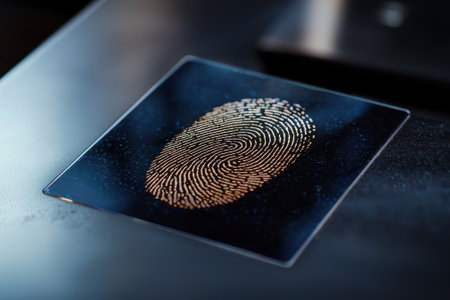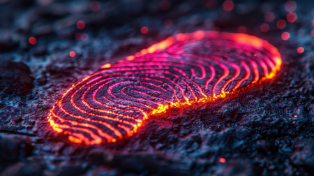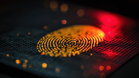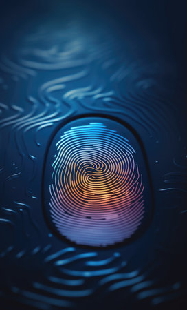 This high-resolution image captures a close-up of a fingerprint on a futuristic surface, emphasizing themes of security, identity verification, and technological innovation.