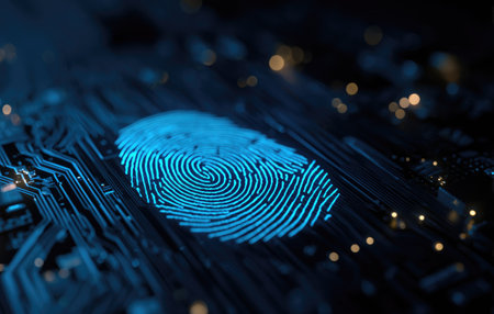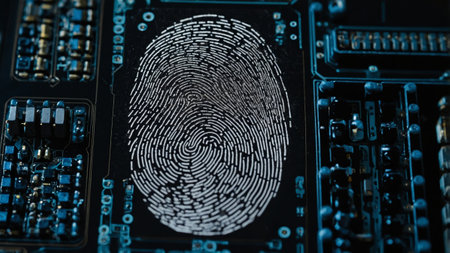 A close-up view presents a glowing fingerprint superimposed on a circuit board, suggesting digital security. The image features a blue and black color palette, with subtle bokeh lighting. The composition and style are futuristic, possibly suitable for commercial and editorial applications related to technology and cybersecurity.