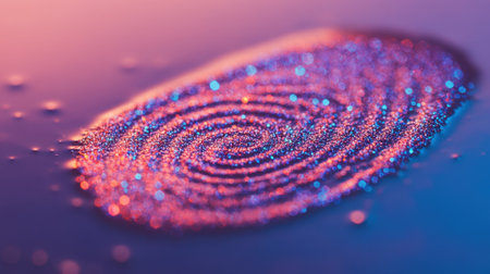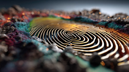 This unique image features an abstract close-up of a fingerprint swirling on a vibrant and textured surface, showcasing intricate details and glistening elements.