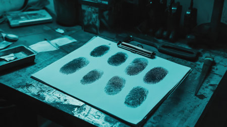 A collection of detailed fingerprint impressions on a clipboard within a dimly lit workspace, showcasing various patterns for forensic analysis and security studies.