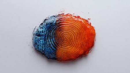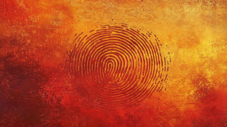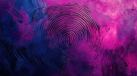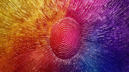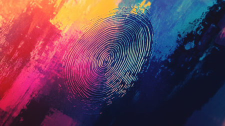 A striking abstract design featuring a detailed fingerprint set against a backdrop of vibrant colors and textures, ideal for themes of identity and creativity.